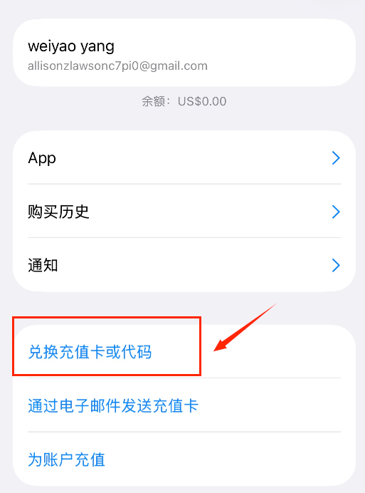 2.点击右上角头像出现以后 继续点击 兑换充值卡代码。切记不是账户充值。
